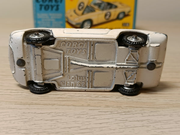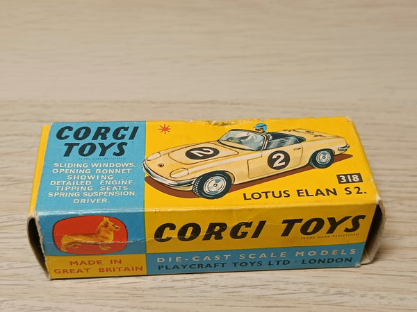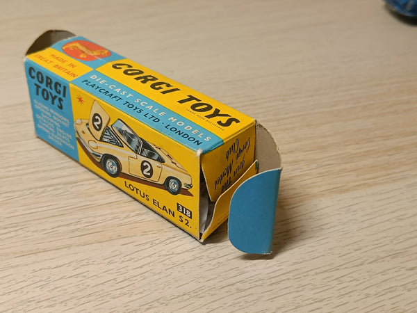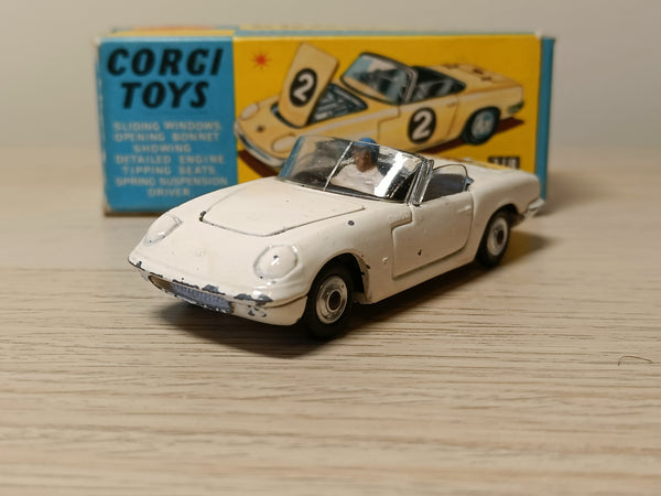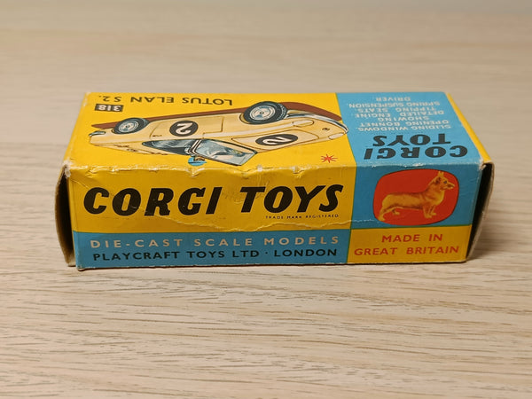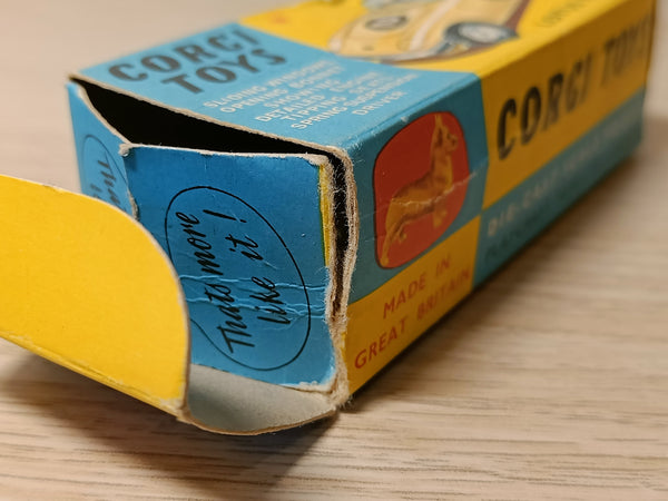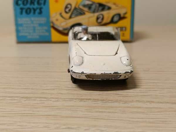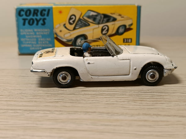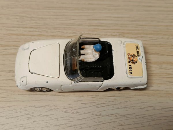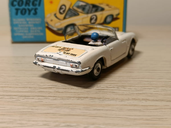 A scarce item. The normal Lotus found in the 318 box is metallic blue. A few white editions are seen from time to time and they are distinguished from the Emma Peel version by having the Tiger In My Tank transfer on the boot panel. All the 318 box models also have the familiar racing driver with the blue helmet.