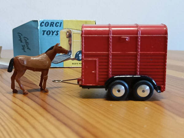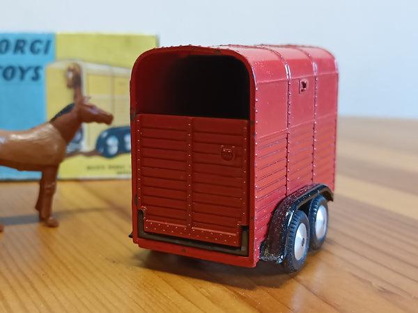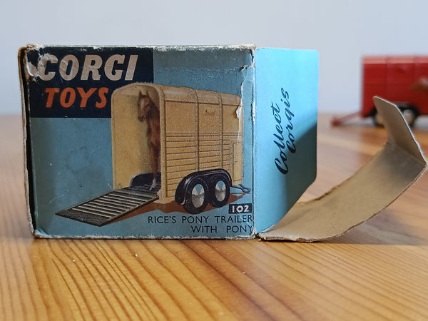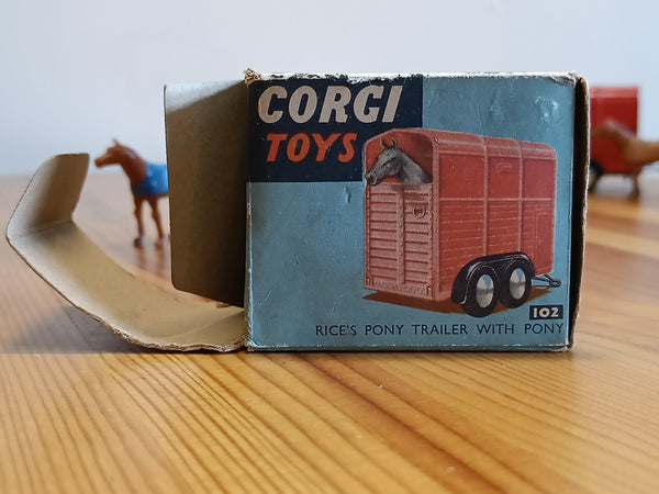 There is also an original blue box that is pretty worn but still clean and now quite rare to find. One end flap has become detached but is still present and could be re-attached. (Some pictures show a later yellow and blue box and another horse with a blue coat - these are available with another item. This red trailer has the the older style blue one and the pony with the brown coat. I will update the photos when I get a chance.)