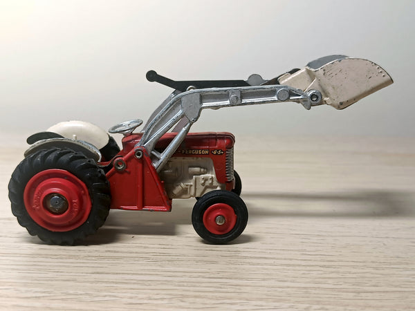 This is a fine example of the Massey Ferguson 65 tractor with a shovel mechanism. It is a later edition with bare metal arms and a cream painted bucket. There are transfers on the bonnet for this version.