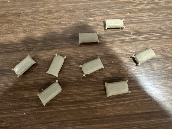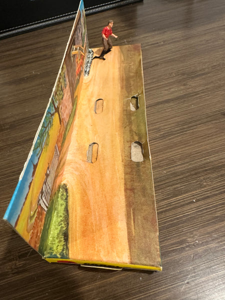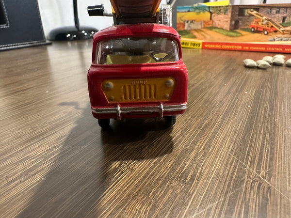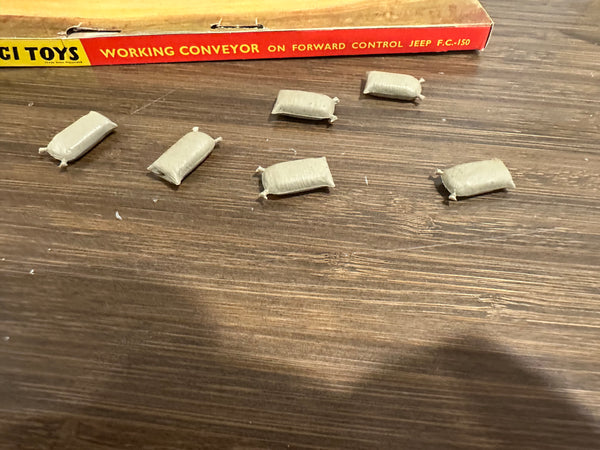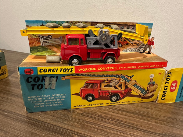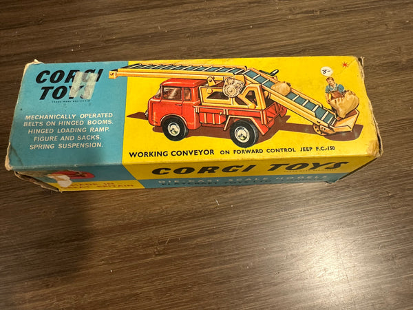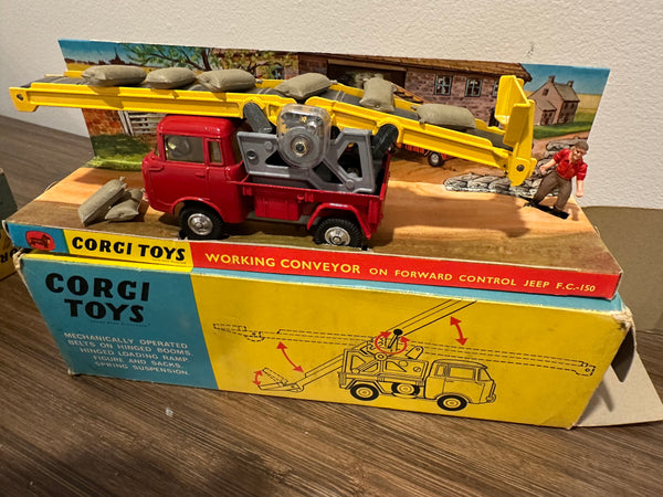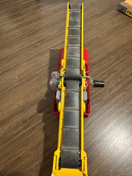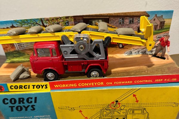 All entirely original. This includes the hard to find and often missing farm worker and 6 sacks. The box has some wear but appears complete. The original black rubber belt is in place and the mechanism still works.