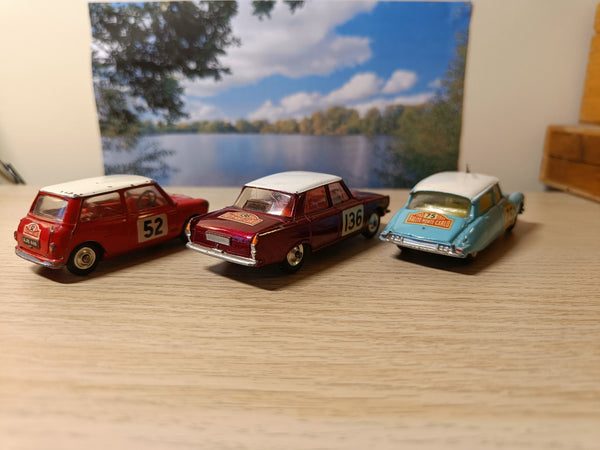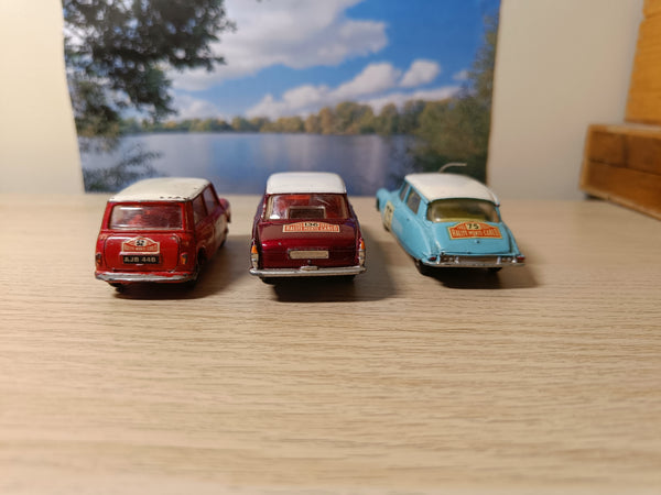 The 321 Mini-Cooper has quite a few signs of playwear as the photos show and it has had some paint added to the white roof. It is, however, otherwise totally original with good suspension, clear windows and all five jewels are in place and original. It has the correct original decals too. Many replacement decals use the wrong font for the RN52.