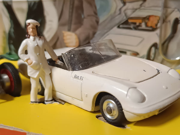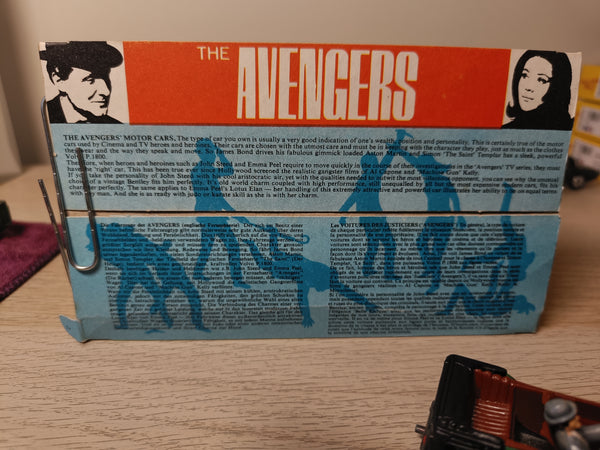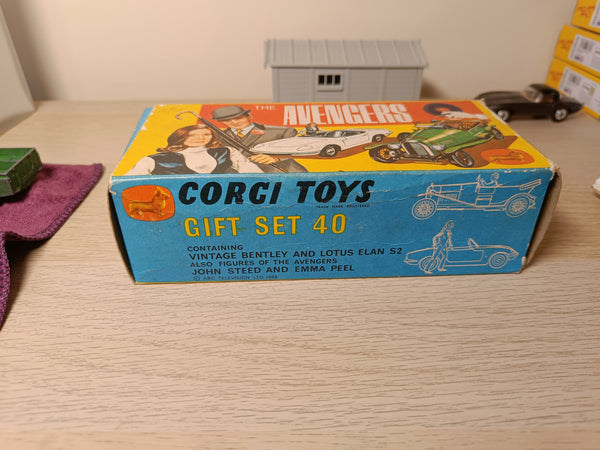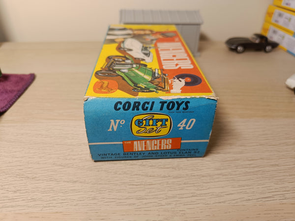 This is a totally original early issue of the Avengers Gift Set. It features the green Bentley with red wheels, a white Lotus Elan S2, original Steed and Mrs Peel characters and even two original umbrellas. All these items are in an original box and tray too.