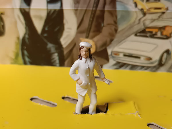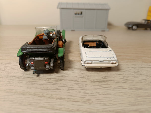 The outer box is complete with all flaps in place. There are signs of age and it has become a little soft but still retains its shape. There is a 15/6 price written in pencil but no graffiti. The tray has signs of wear where models and Mrs Peel have been placed and moved over time but it is still intact and, of course, looks fine with the cars in place.