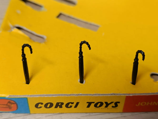 To have some original brollies is extraordinary and most rare. It is not easy to distinguish these at a distance but replacements are either metal or, where they are plastic, they lack the detail of the originals, mainly in the furling and at the foot or tip where you will also see remnants of where they have been attached to a sprue. I will actually be happy to keep these myself so can offer a £80 reduction should you be content to have good replacement brollies instead.